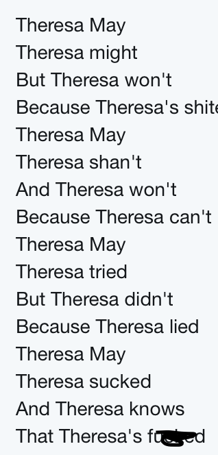 Given today's 'brexit' omnishambles, (and her Northern Ireland allies abandoning her along with her own party), this poem is doing the round. I posted it as a picture so as not to break the rule about cut and paste.