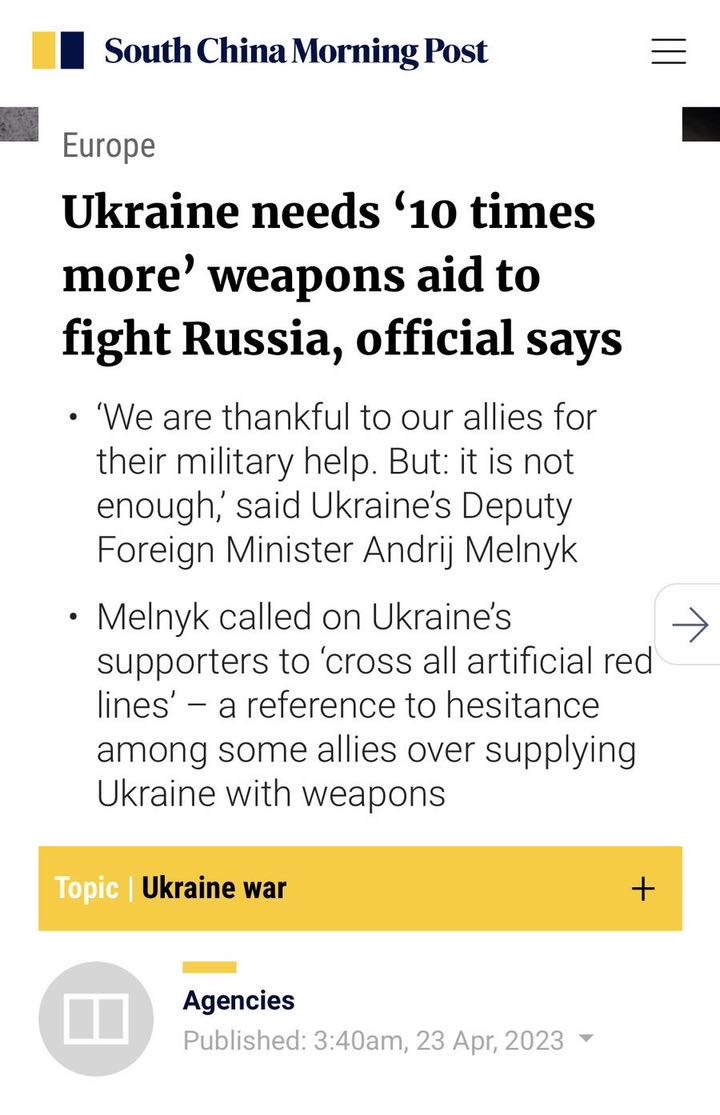 The deputy foreign minister (same guy that was ambassador to Germany and said Bandera is a great guy), stated that Ukraine needs "TEN TIMES" the amount of weapons it has received to date, if Ukraine is to be expected to finish the war this year. I think even Poland, which is Robin to Ukraine's Batman, can not stomach a level of aid to Ukraine that is 10X of current levels.